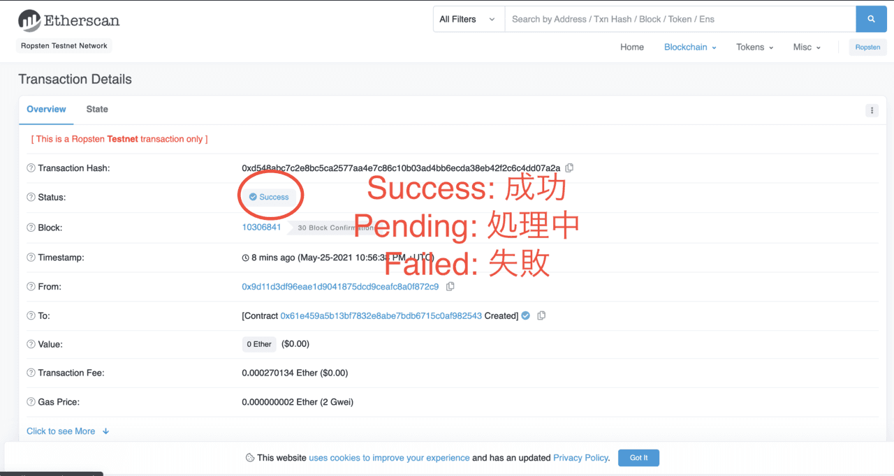トランザクションの確認(新しいスマートコントラクトの作成)