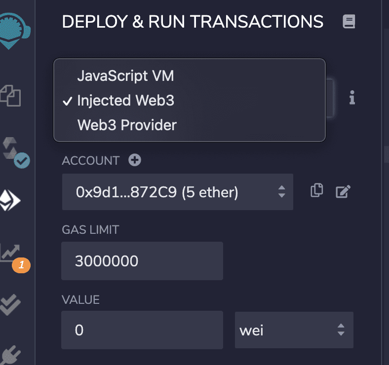 ここからが大事なポイントです。 ENVIRONMENT を変更します。デフォルトでは「JavaScript VM」になっていますが、Metamask を使うためにここを「Injected Web3」に変更します。